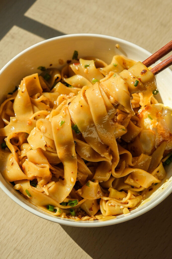 I love making this dish using biang biang noodles – a type of thick hand-pulled noodles. It’s chewy, and soaks up all the flavours, making it super addicting, which is why I highly recommend using wide knife-cut noodles for this dish. However, you can also make this using any noodles of your choice, such as instant ramen or udon.