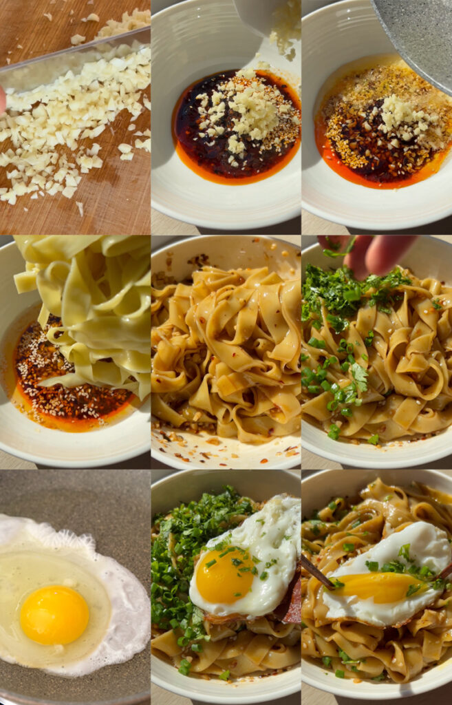 - Heat up the neutral oil in a saucepan until sizzling hot. Pour the hot oil onto the garlic chili oil mixture. Add in the noodles and mix with the sauce.