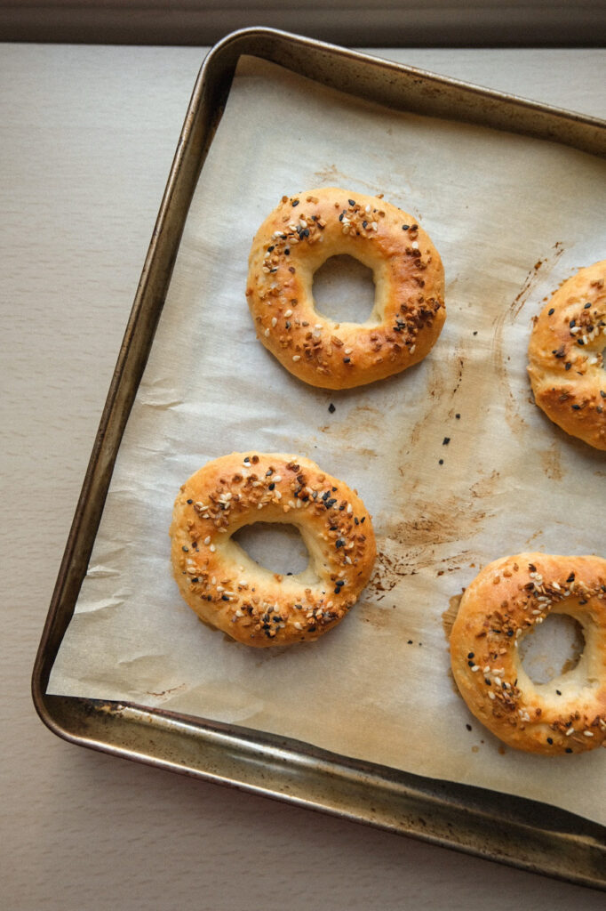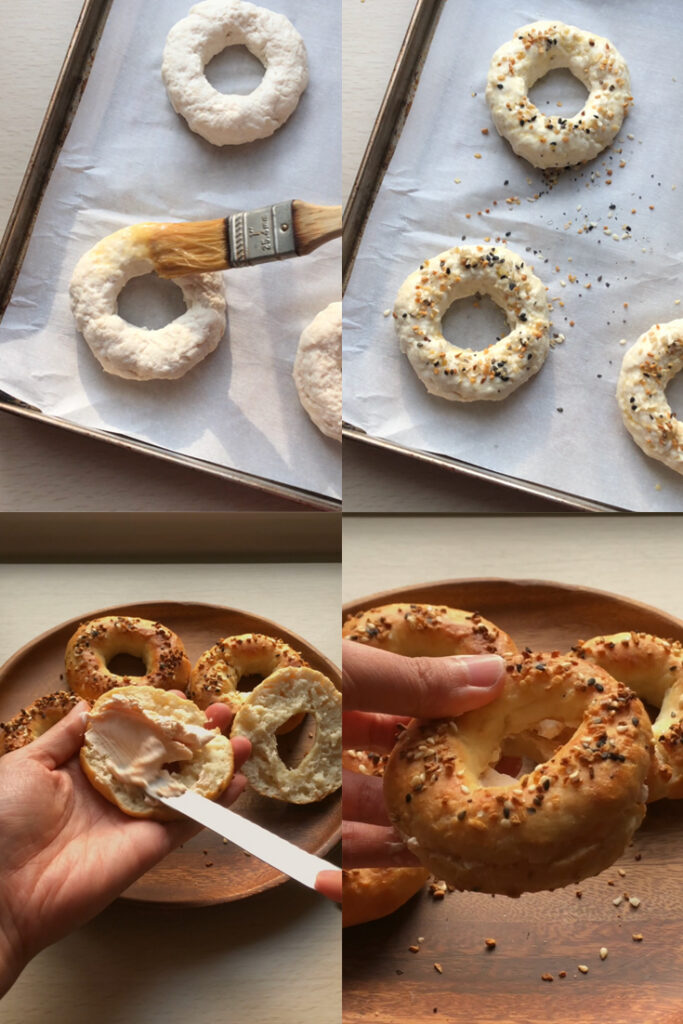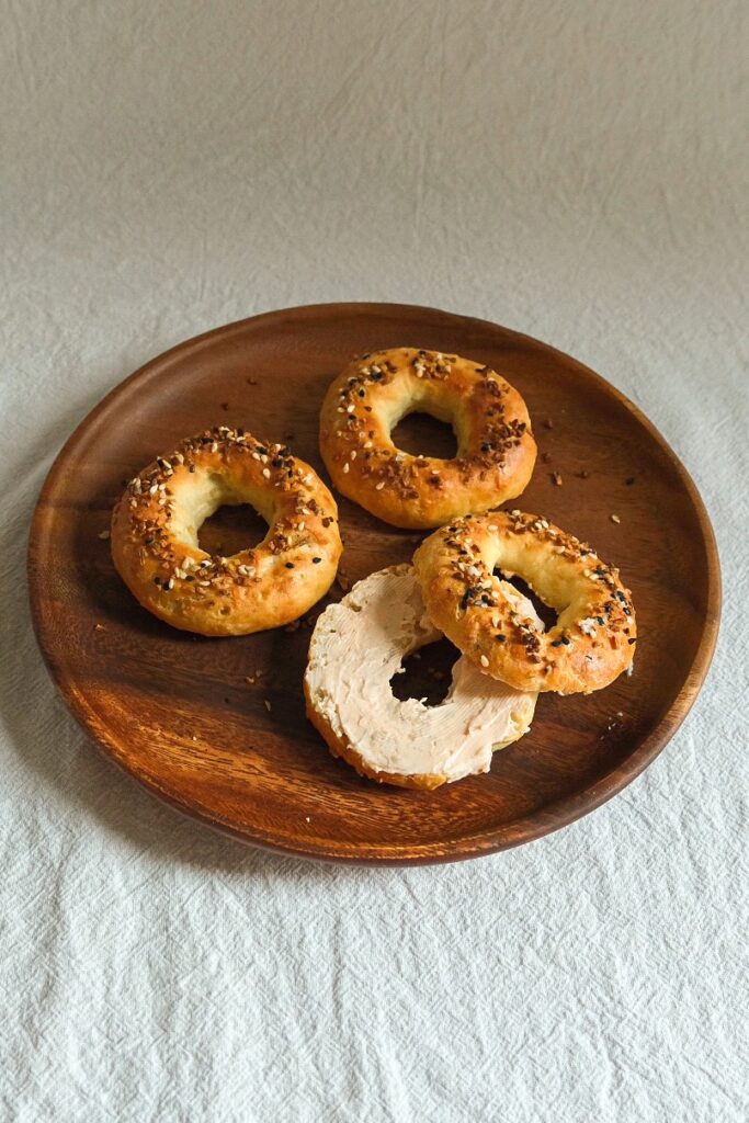 You won’t believe how ridiculously easy it is to make these bagels. Soft and bread-like on the inside, while having a slight crunch on the outside. I also ONLY recommend having them warm for the best texture. If your bagels have hardened, place a damp paper towel on top of the bagels and pop it in the microwave for 15 seconds. Soft bagels once again.