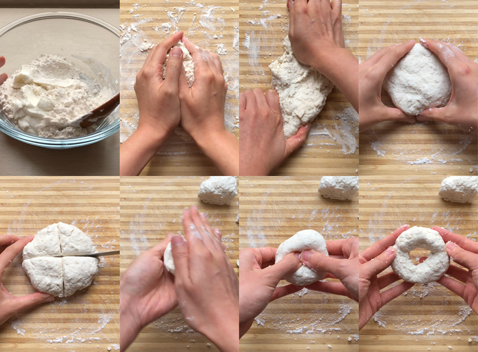 3. Divide the dough into 4 sections with a knife and shape each section into a ball. Make a hole in the centre of each ball and gently stretch the dough to shape them into bagels.