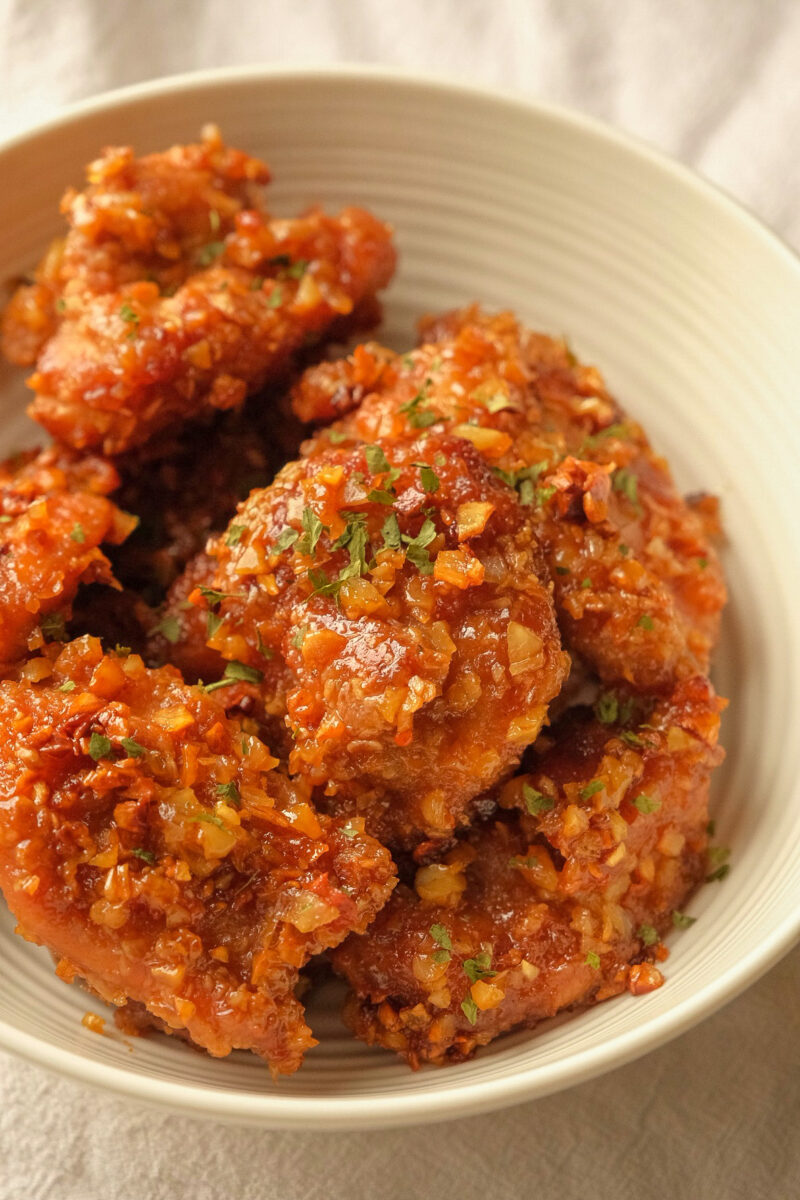 Fried chicken pieces tossed in a sweet and savoury honey garlic sauce, and when I mean garlicky – I mean A LOT of garlic. This is a super easy fried chicken recipe that you can make at home with easily…