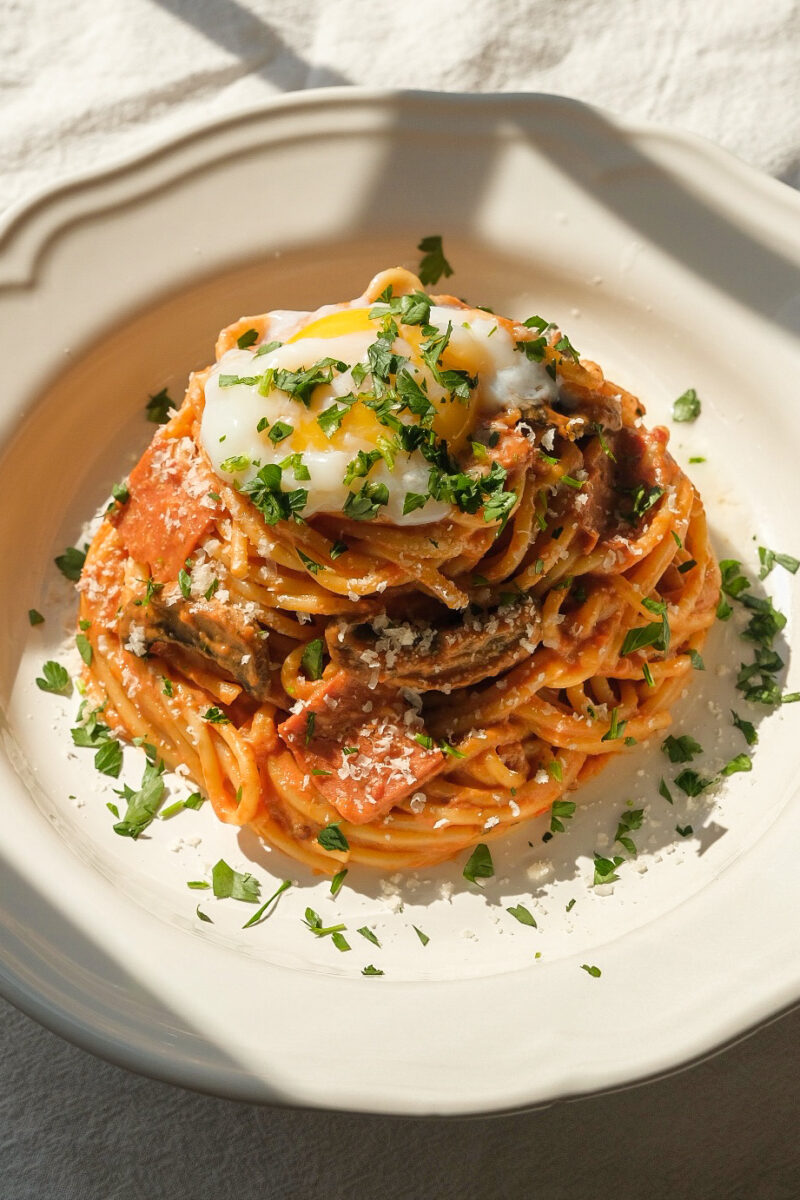 Carbonara, but mix in some Japanese fusion into it. Super creamy red carbonara mixed with a silky and custardy onsen egg. Mix it altogether, take a big bite, and you’ll be craving for more. I love Japanese-style pastas. Well, I…