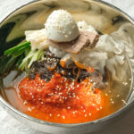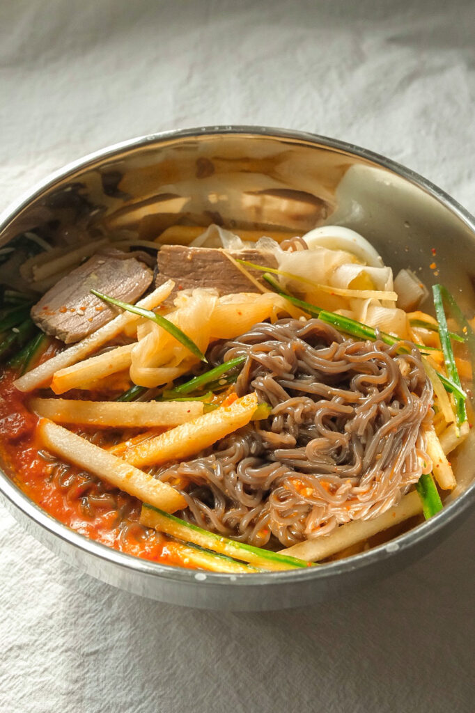 • Add cucumber, pear, pickled radish, beef brisket, egg and the sauce on the noodles. Pour a little of the broth on the side. Garnish with sesame seeds. Mix it up and enjoy!