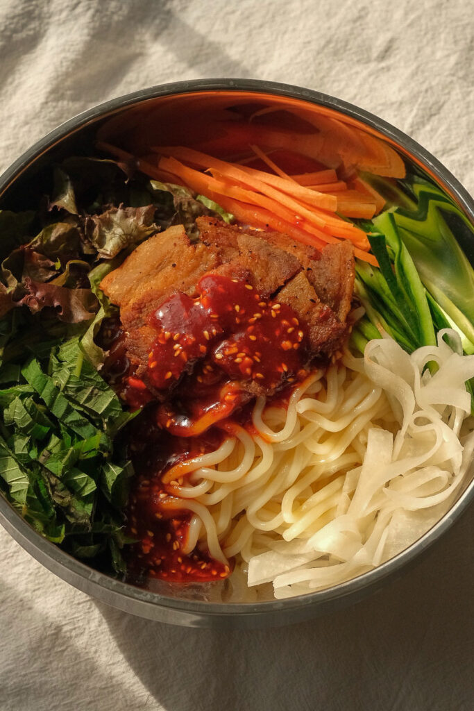 You can customize your jjolmyeon however you like. Usually, they’re served with lots of vegetables and a hard boiled egg, but I wanted to add something special – samgyeopsal (grilled pork belly). It’s like KBBQ noodles. Simply season both sides of the pork belly with salt and pepper, and grill each side until golden and crispy. Cut into small pieces like how you usually would do at a KBBQ restaurant.