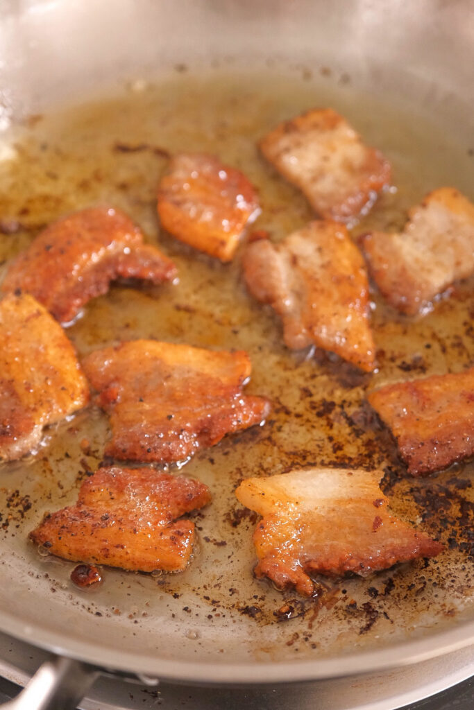 • In a pan over medium-high heat, cook the pork belly until both sides become golden brown and crispy. Season both sides with salt & pepper while cooking. Cut into small pieces.