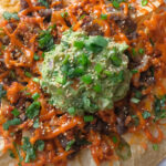 5. Remove from the oven, and top with the kimchi, gochujang mayo, guacamole, toasted sesame seeds, green onion and cilantro. Enjoy immediately!