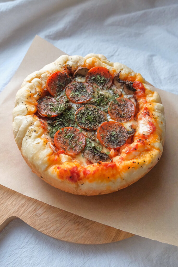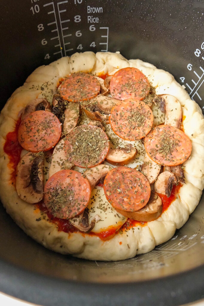 - Place the second piece of rolled out dough on top, while pinching the sides to close it up and form a crust. Spread on the remaining half of the marinara sauce, and top with the rest of the garlic, shallots, mozzarella, mushrooms, and pepperoni. Sprinkle on the dried herbs. Close the lid and cook it for 40 minutes using the steam function (yes, just trust the process). Remove and slice. Enjoy!