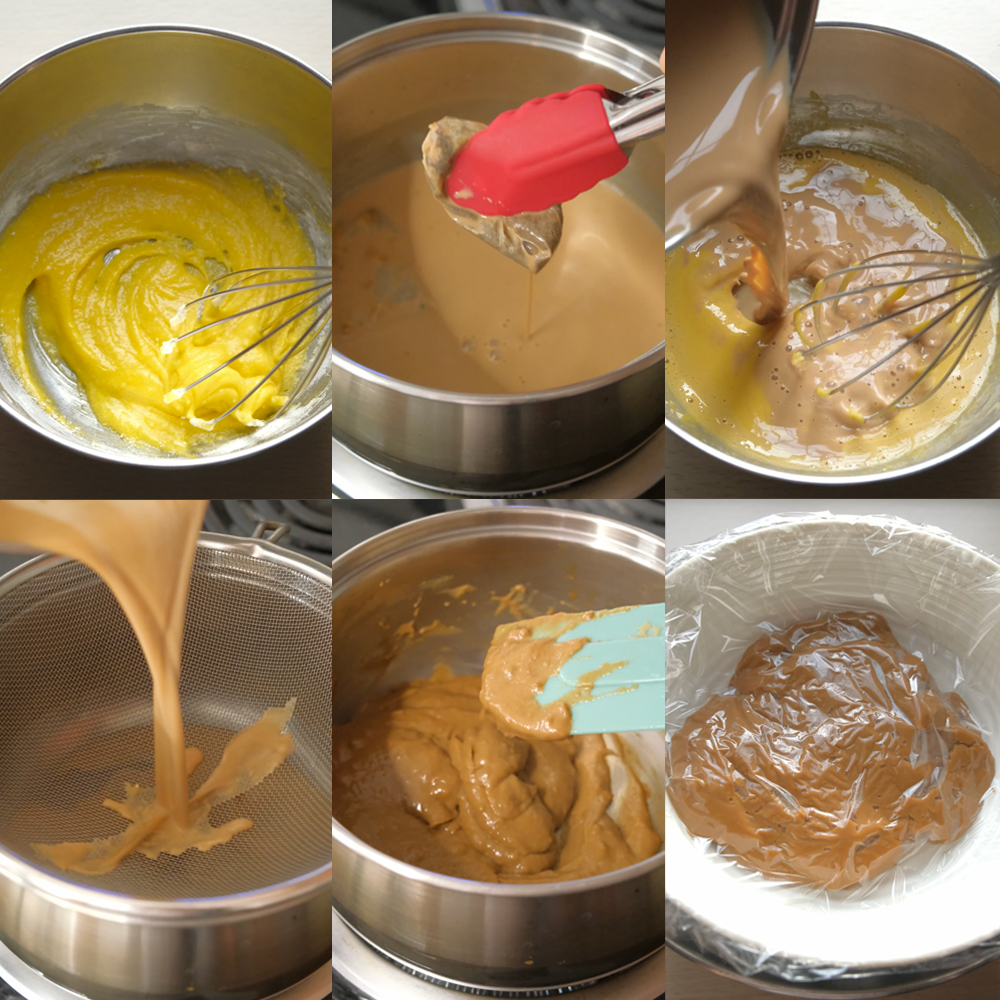 - Sieve the mixture back into that same saucepan. Cook the mixture over medium-low heat while mixing with a silicone spatula continuously until it thickens. Custard should be shiny and not stick to the spatula.