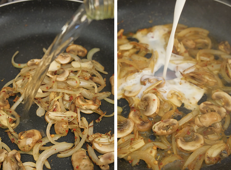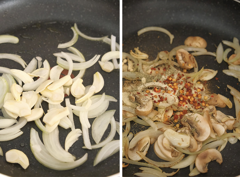 2. While the noodles are cooking, add the olive oil to a pan over medium heat. Add in the onion and garlic and cook until fragrant. Then add in the mushrooms and season with thyme, garlic powder, and red pepper flakes. Cook for about a minute.