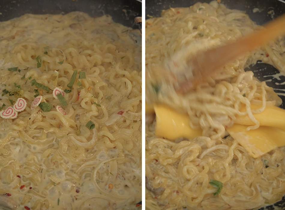 4. Drain the noodles and add to the pan, followed by the toppings packet (included with the ramen package) and toss everything to combine.