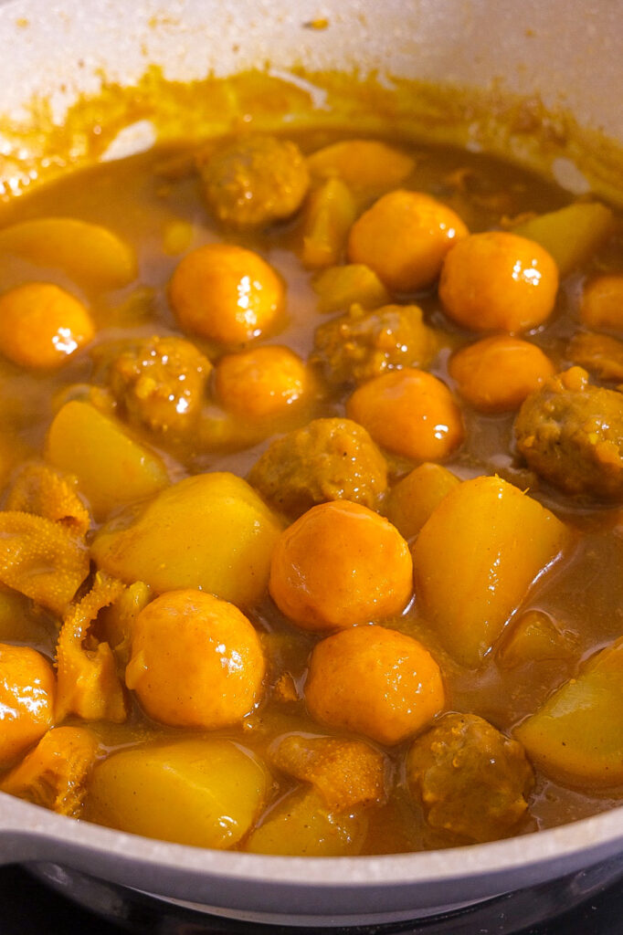 - Season the curry by adding salt, sugar, oyster sauce, and soy sauce. Mix in the cornstarch slurry (mix the 2 ingredients in a bowl first) to thicken the sauce a little. The fishballs and beef balls should be finished with a glossy and shiny look. Plate and enjoy!