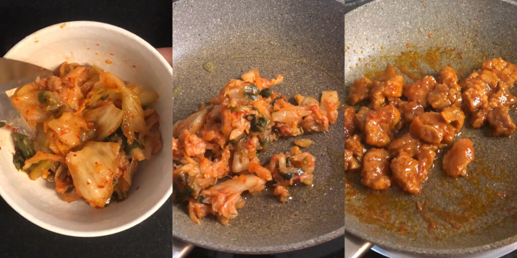 - In a bowl, cut the kimchi with kitchen scissors into smaller pieces. Heat a small skillet over medium high heat and add the vegetable oil. Stir fry the kimchi for about 3 mins. Set aside in a bowl.