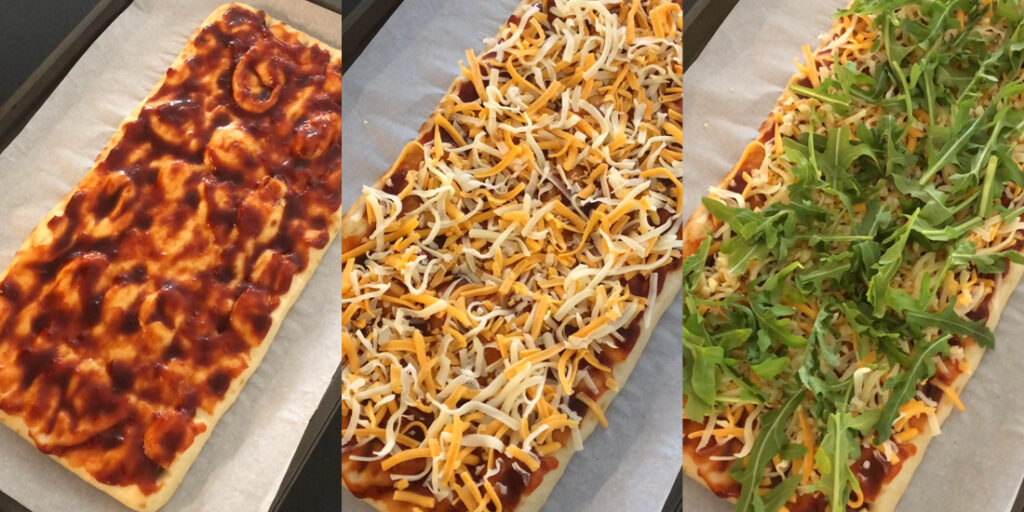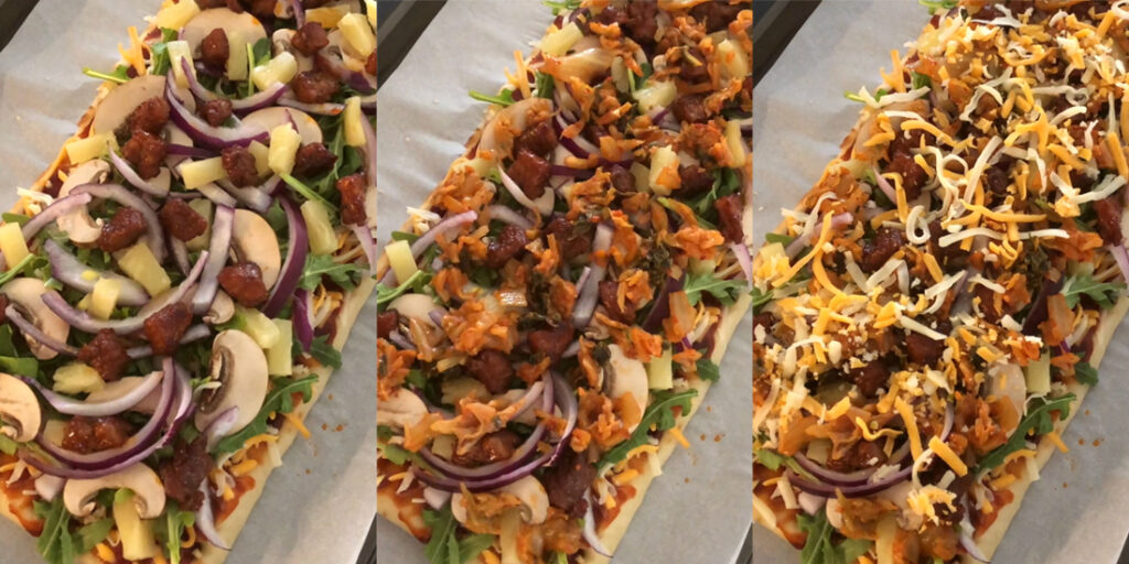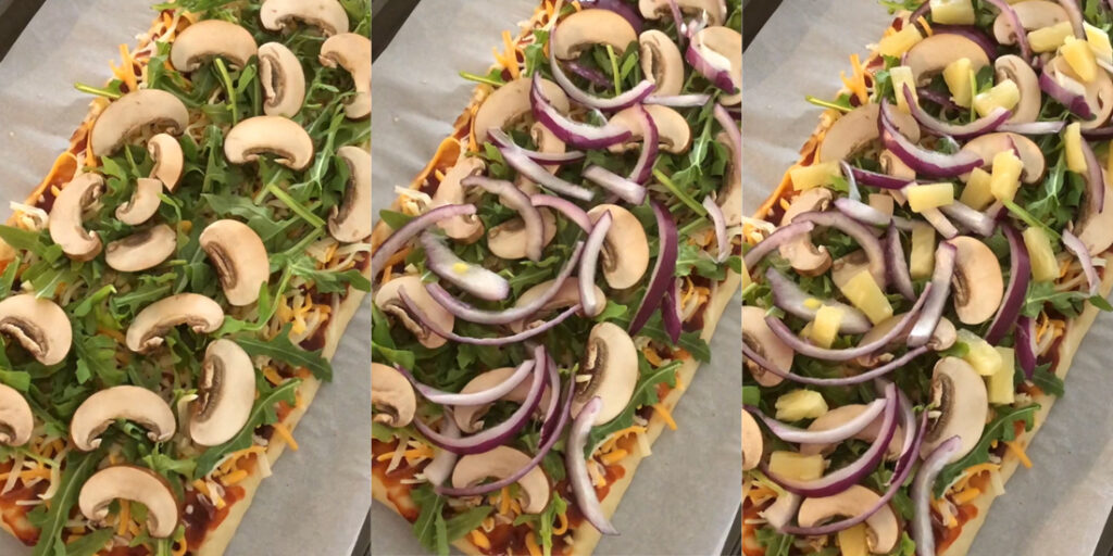 - Place the flatbread on a lined baking tray. Spread the KBBQ sauce on the flatbread evenly. Add on the cheeses, minced garlic, baby arugula, mushrooms, red onion, pineapple, samgyeopsal, and kimchi. Top with more cheese at the end.