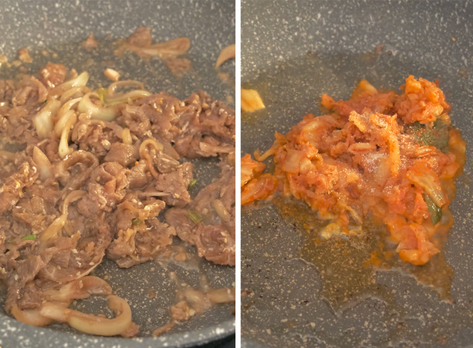 3. Using the same skillet, stir fry the kimchi with sesame oil and sugar for about 3-5 minutes. Set aside.