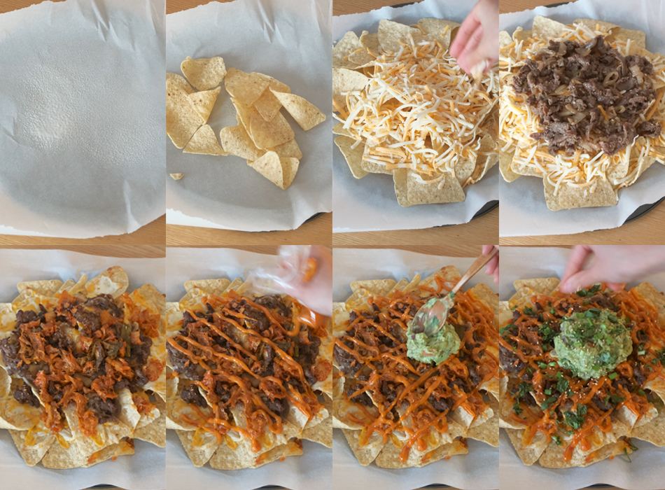 4. Place tortilla chips in an even layer on a lined baking tray with nonstick cooking spray. Top with the cheeses and bulgogi. Bake in the oven for 5-7 minutes, until the cheese has melted.