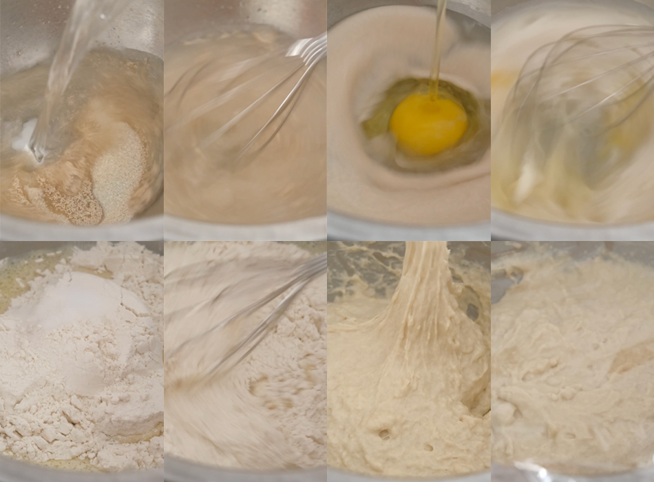 - In a large mixing bowl, whisk together the yeast, sugar and warm water. Let it sit for 5-10 minutes for the yeast to activate and appear bubbly. Whisk in the egg. Add in the bread flour and salt to the mixture and whisk to combine (make sure there are no dry lumps remaining). Cover with plastic wrap or a wet cloth and let it rest for 1 hour, or until doubled in size.