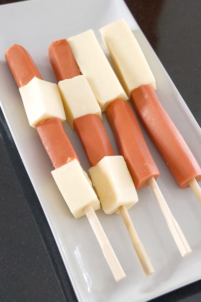 - Let’s prepare the skewers. I am using wooden takeout chopsticks because they have a much stronger hold than regular skewers. Skewer on the hot dogs, followed by the cheese. You can also mix and match it however you like.