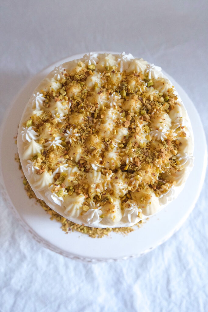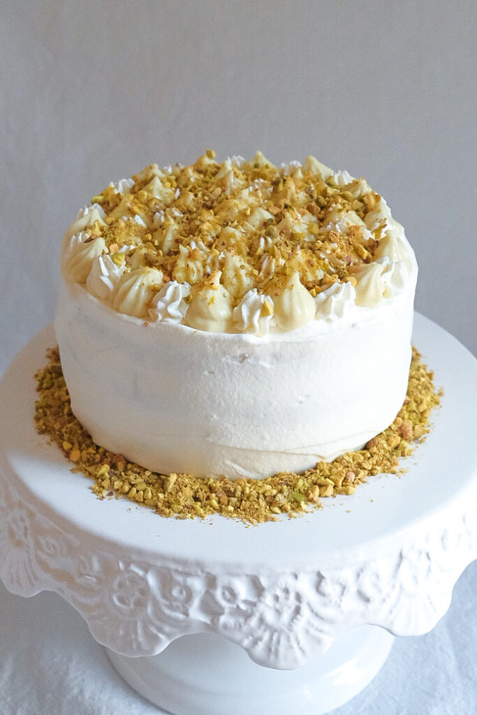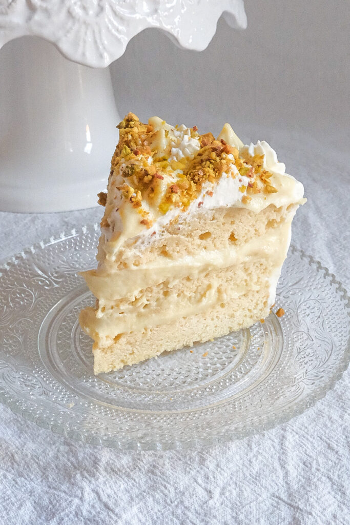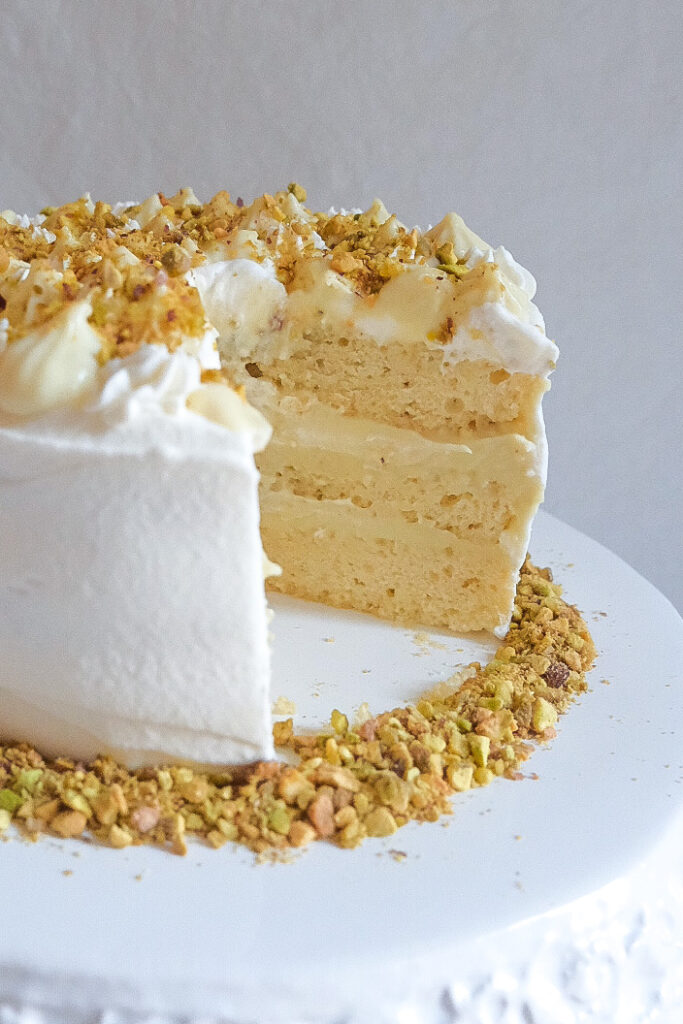 - Decorate it however you like! I had extra sweet potato filling leftover, so I just piped it on top along with the whipped cream. Top with finely chopped pistachios (optional). Slice, serve, and enjoy!