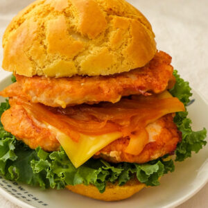 Inspired by Macau’s famous pork chop buns, this one is the bun of your dreams. Juicy pan fried pork chops with caramelized onions, served in a bakery classic – the pineapple bun (slightly sweet with a crispy crust).