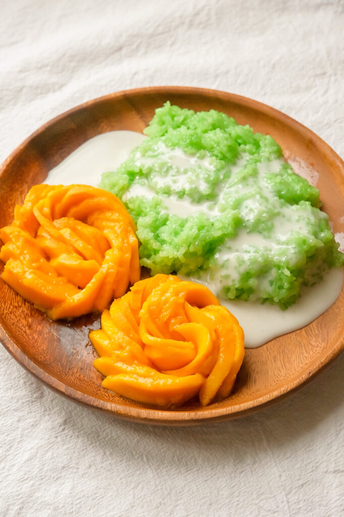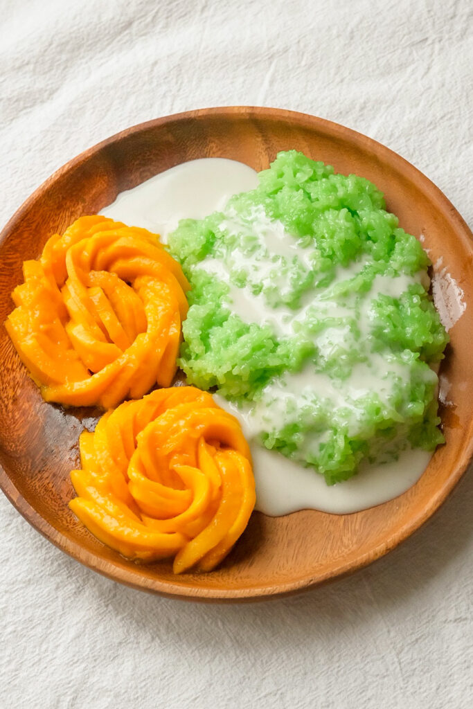- Serve the rice with the sliced mangoes. Spoon some of the pandan coconut sauce on top and enjoy!
