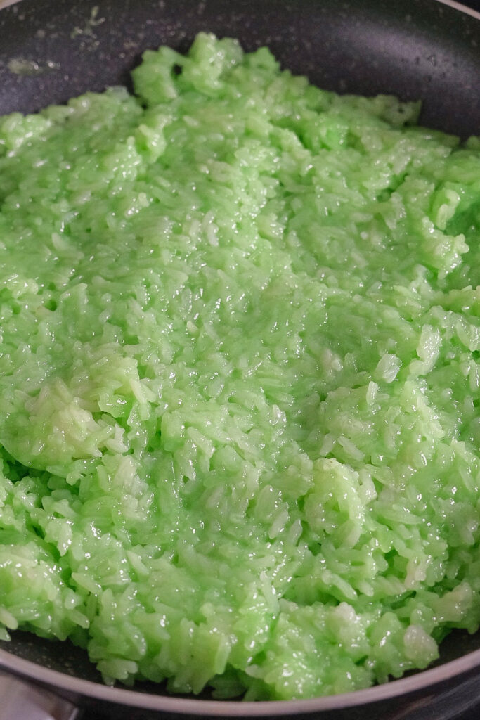 This pandan sticky rice – so so good. When I say that it’s full of pandan flavours, it’s definitely FULL of pandan flavours. I always add the real stuff (yes we are also using real pandan leaves here along with the pandan syrup!) so that the flavours would come out as amazing as you would imagine. The key tip to making the pandan sticky rice is to let the rice absorb all that liquid when you fold the rice. It then produces a nice “sticky rice being pan fried” sound, along with a slightly glossy finish.