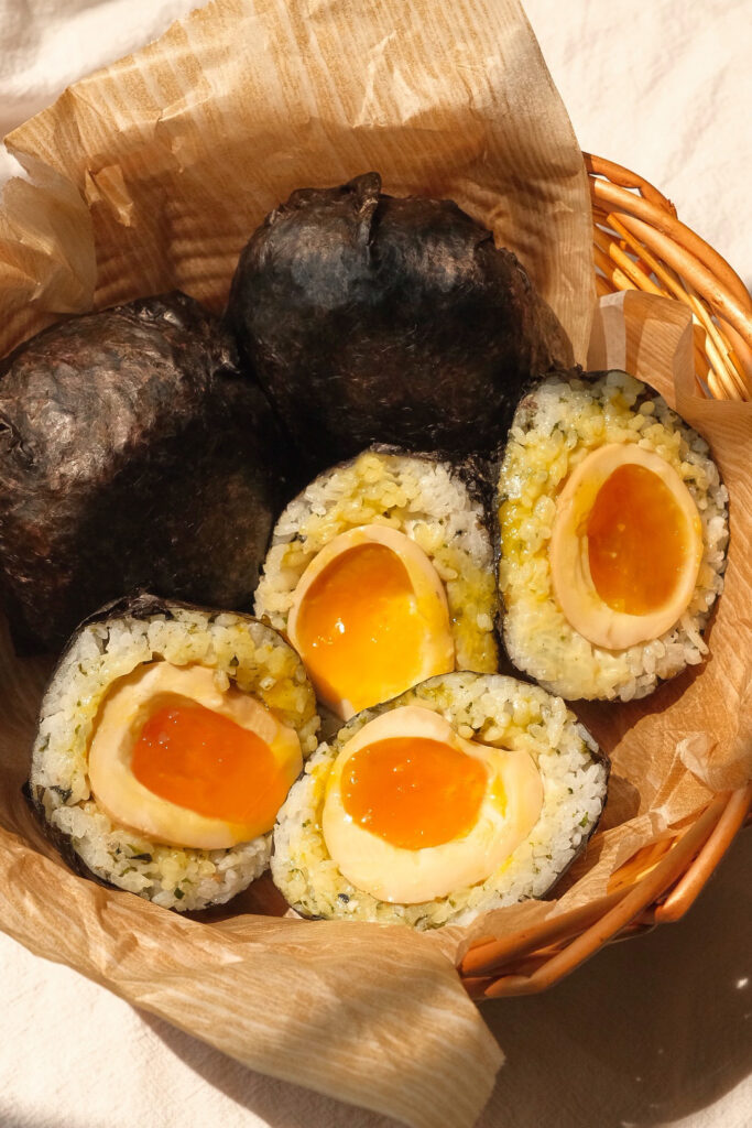 The idea for ramen egg onigiri came from a small onigiri vendor I saw in Japan. I saw there were large eggs wrapped inside rice and nori, and when I took a closer look and bite, they were actually ramen eggs with a jammy yolk. It was surprisingly so delicious, and at that moment, I knew that this could be something I can easily make myself.