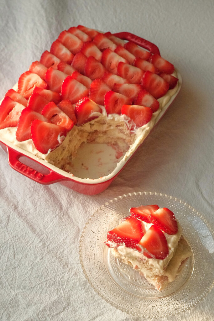Me, the tiramisu queen, has come back again with another tiramisu recipe. It’s strawberry season, which means it’s time for strawberry desserts. Ladyfingers dipped in a homemade strawberry syrup with natural ingredients, vanilla flavoured mascarpone, strawberry cream, and lots and lots of fresh strawberries. This no-bake creamy dessert is just perfect for the summer (or anytime of the year whenever you’re craving for it).