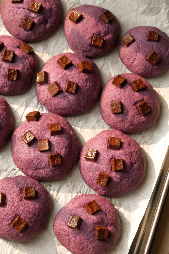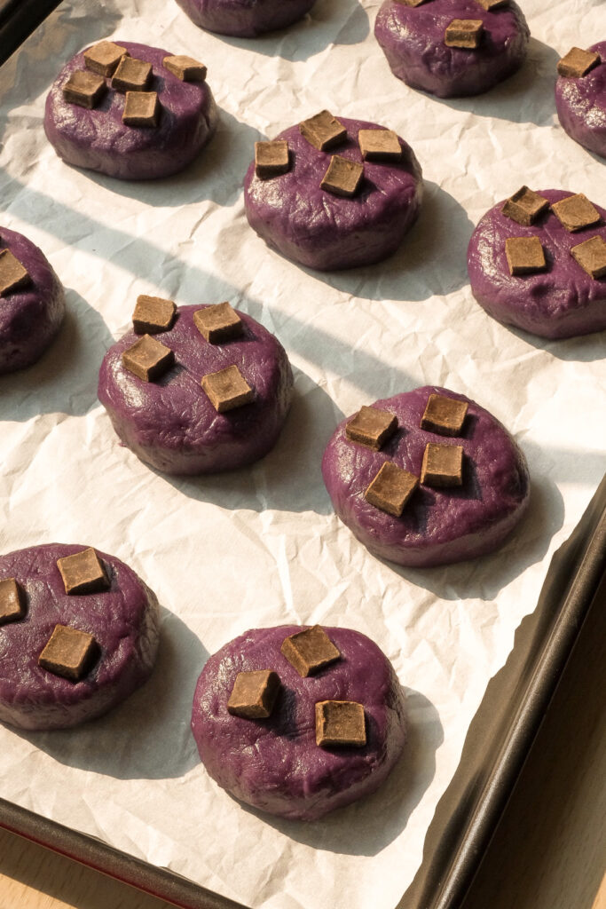 I decided to add a purple yam filling inside these cookies to increase the ube flavour even more, and that was the best decision I’ve ever made for these cookies. We first steam the purple yam, and then mash it with condensed milk until smooth. Add a teaspoon of the filling in the centre of each cookie and wrap it up. When you take a bite, all the ube flavours will be melting on your tongue.