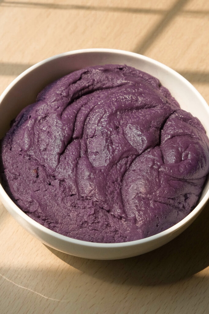 - Mash the purple yam while it’s hot. Add condensed milk and mix until combined and smooth. Let cool and set aside.