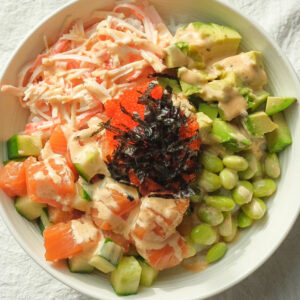 The creamy togarashi sauce is a blend of Japanese spices that’s slightly spicy, but has a toasty and umami flavour. I wanted to create a sauce that poke bowl restaurants would usually serve in their poke bowls, and thus, this creamy sauce came to life. You can also use this sauce for other foods such as sushi, or as a dipping sauce.