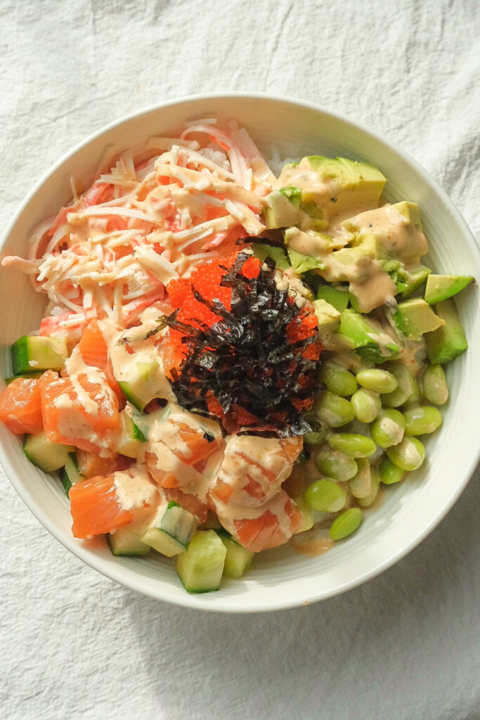 Summer = poke bowl time. Soy salmon sashimi + creamy crab + delicious toppings, finished off with a drizzle of creamy togarashi sauce.