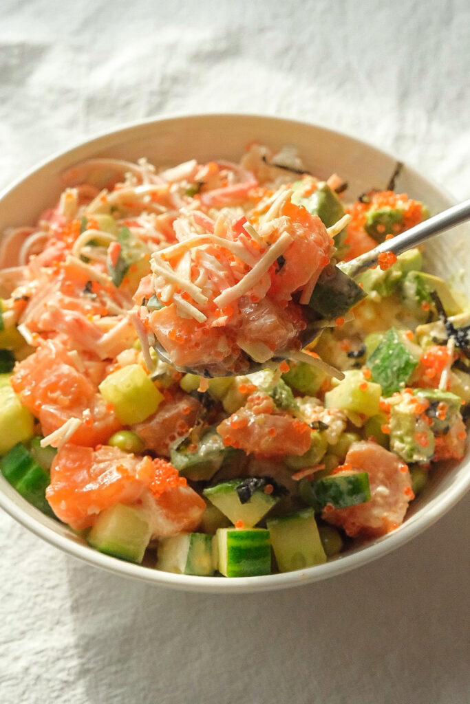 - In a large mixing bowl, combine all the ingredients together except for the salmon and cucumber. Add in the salmon and marinate for 5-10 minutes. Then, add in the diced cucumber.