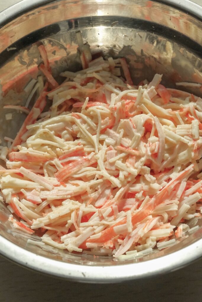 For the creamy crab, only three ingredients are required: imitation crab sticks, Japanese mayo, and smoked paprika.