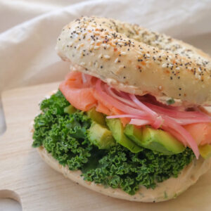 - Top with kale, avocado, smoked salmon, and pickled red onions. Place the other half of the bagel on top and enjoy!