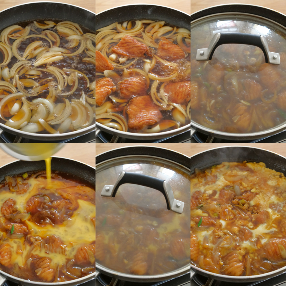 - In a large pan over medium high heat, add the onion, water, soy sauce and mirin. Give it a stir and bring it to a boil.