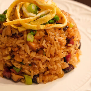 Then add in the Chinese mushrooms, dried shrimp, and shallots. Give it a good mix.